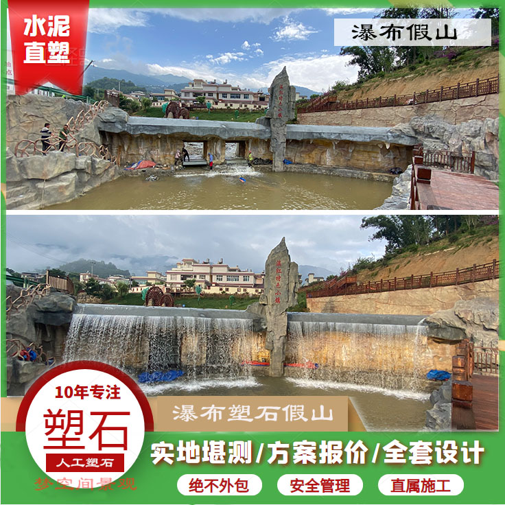 利用水泥直塑的人造溶洞用在景觀項目的設計制作并不復雜,很多專業的塑石假山公司都可制作,而在制作的時候選相關專業公司來進行設計施工,可以保證施工的各種細節得到執行,如果是直接與相關的施工工人合作的話就需要自己有相關的審美與經驗來指導工人的操作了,因為工人的操作有很大的隨機性,需要自己多把關才行。下面是我們在云南制作的水簾洞人造溶洞壩體改造項目,讓我們一起欣賞一下吧!